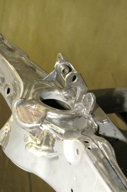 Our bare subframe arriving from the good folks at Detroit Speed and Engineering. DSE welded in new upper control arm mounts and modified the frame for their coilover shocks. DSE also added many more welds to the box frame than the factory did, ensuring a rigid structure. |