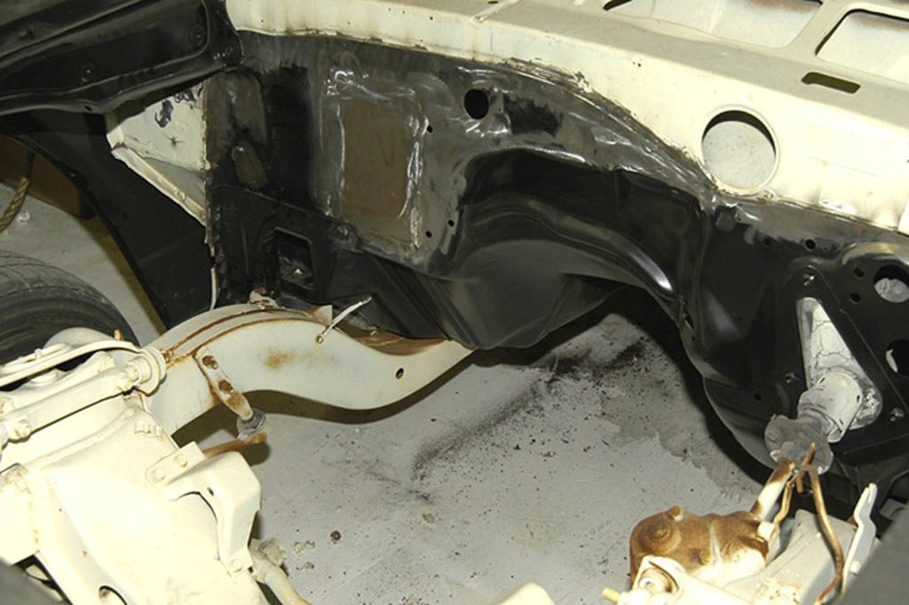 The floor pans were in rough shape, which led to replacing the entire floor with one of the full floor pans from Dynacorn (PP-140). The original under floor bracing was in extremely good condition; surprising considering the heavy rust damage to the entire original pan. |