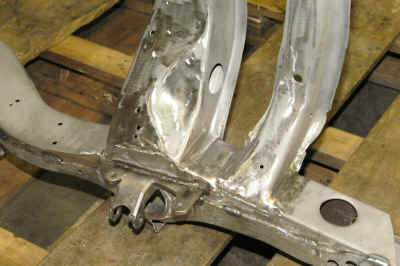 Before we finish the body work and send the RS to paint we will test fit the motor, transmission, air conditioning and suspension, probably using an LS1 with a 6 speed, 12 bolt posi rear with Hotchkis front & rear sway bars, DSE tubular a-arms and front coil over suspension. Just in are the new Hotchkis Frame Connectors manufactured specifically for convertibles. First, the subframe: |