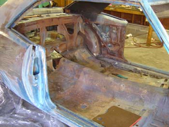 Rotisserie mounted, the entire underside was blasted with plastic media. The good folks at "440" didn't originally spend much time on the bottom of the car in the way of prep work; therefore the original white paint was heavily flaking from poor adhesion. Not wanting the same problem, the underside received the same care as the upper body. Except for the butt seamed USA manufactured RH rear floor pan from (PP-14R) all the rest of the original metal was retained. |